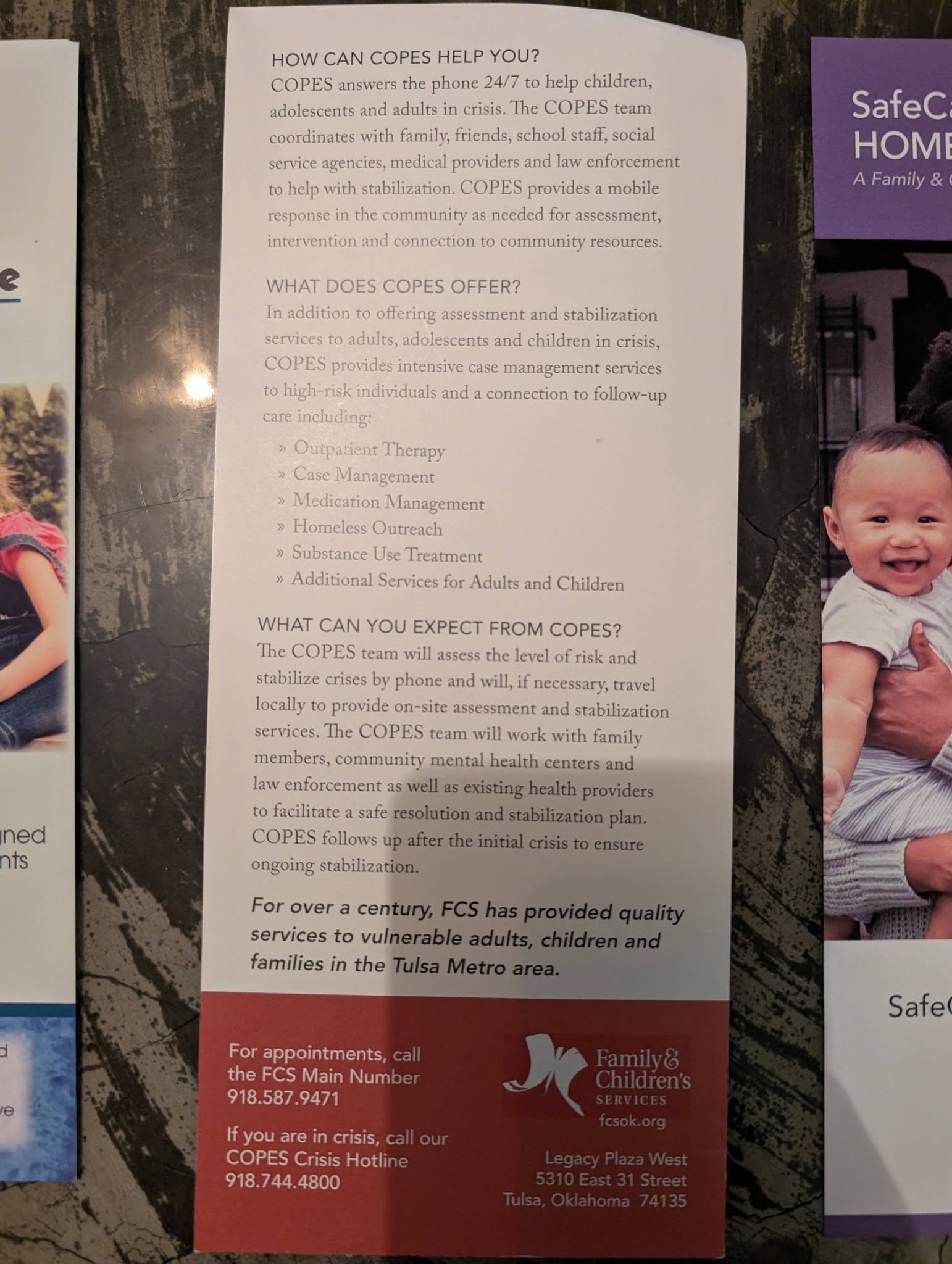COPES is Oklahoma’s only 24-7 free mobile crisis program serving adults and children in psychiatric crisis, in addition to offering other, non-emergency supports.