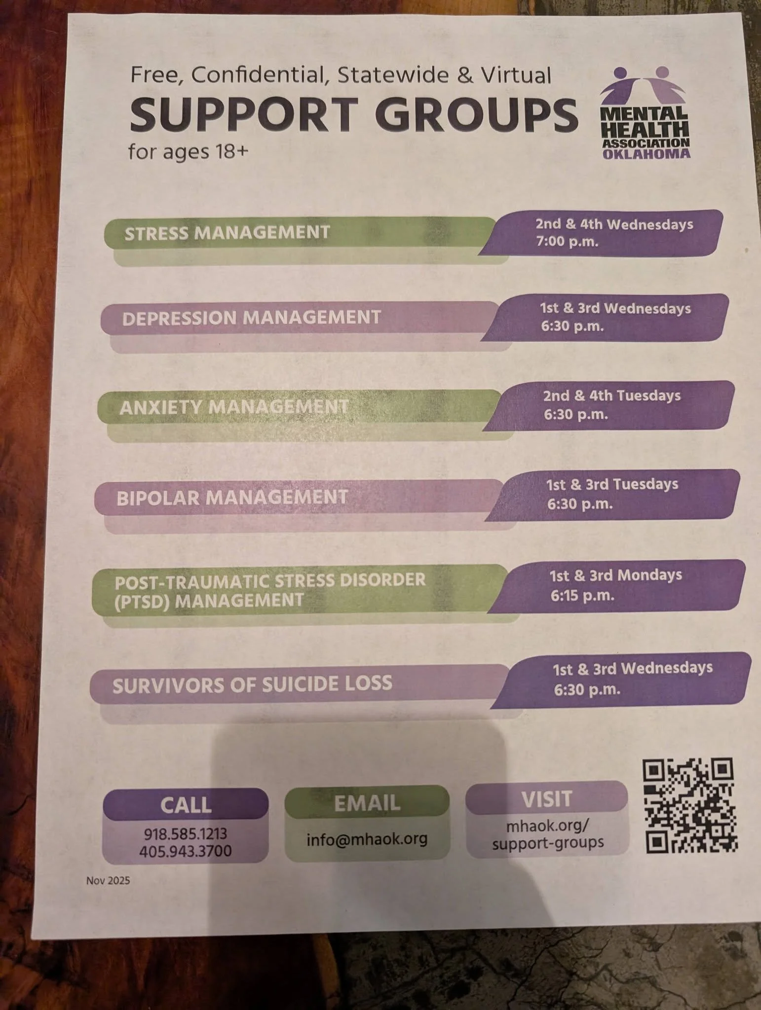 The Mental Health Association of Oklahoma has a number of free support groups. Each of their support groups is led by a trained facilitator but the real power of their groups is getting to interact with other people impacted by mental illness or similar situations.
